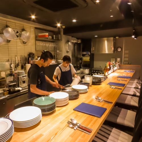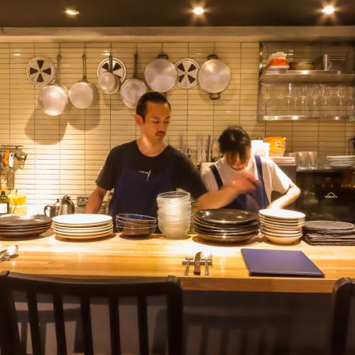 【オープンキッチンならではのライブ感をお楽しみください】当店人気のカウンター席はオープンキッチンとなっており、料理のライブ感や気さくなスタッフとの会話を楽しみながらお食事いただけます。お1人様からご利用いただけますので、お近くにお越しの際はお気軽にお立ち寄りください♪
